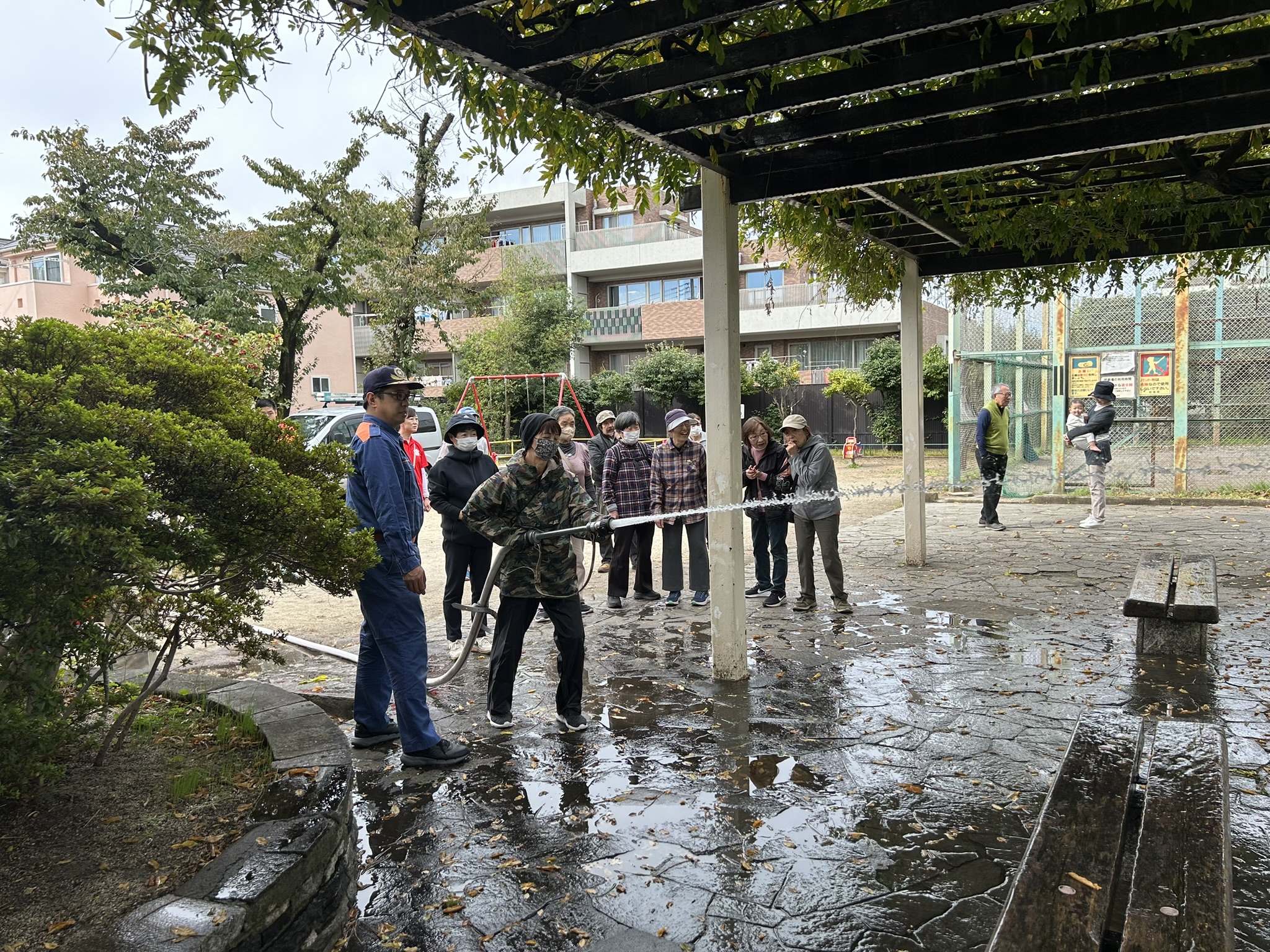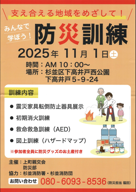 高井戸三小、高井戸東小の震災救援所の震災訓練への参加のほか、自主的に防災訓練を行っています。