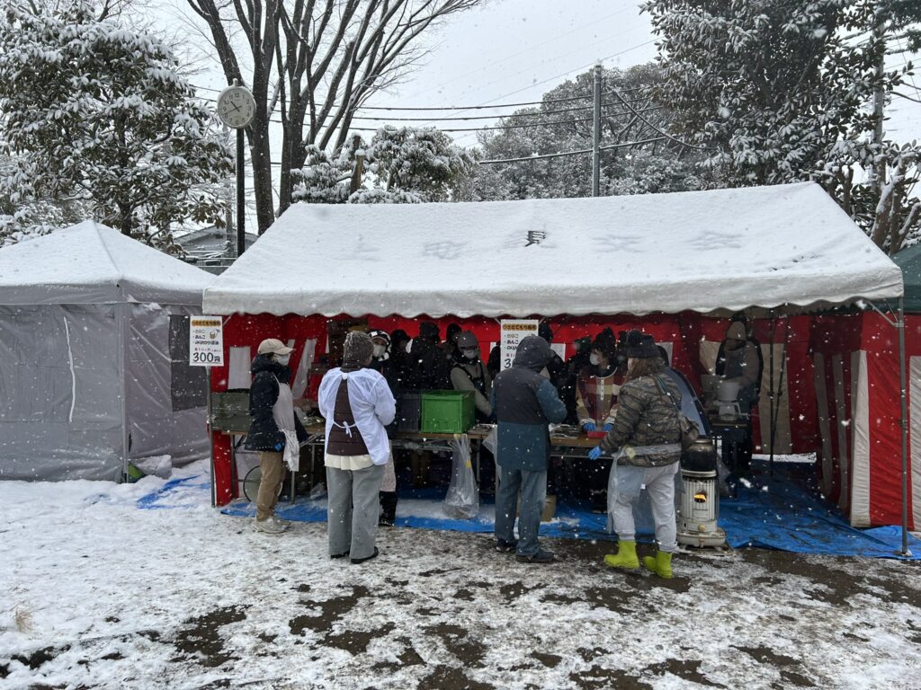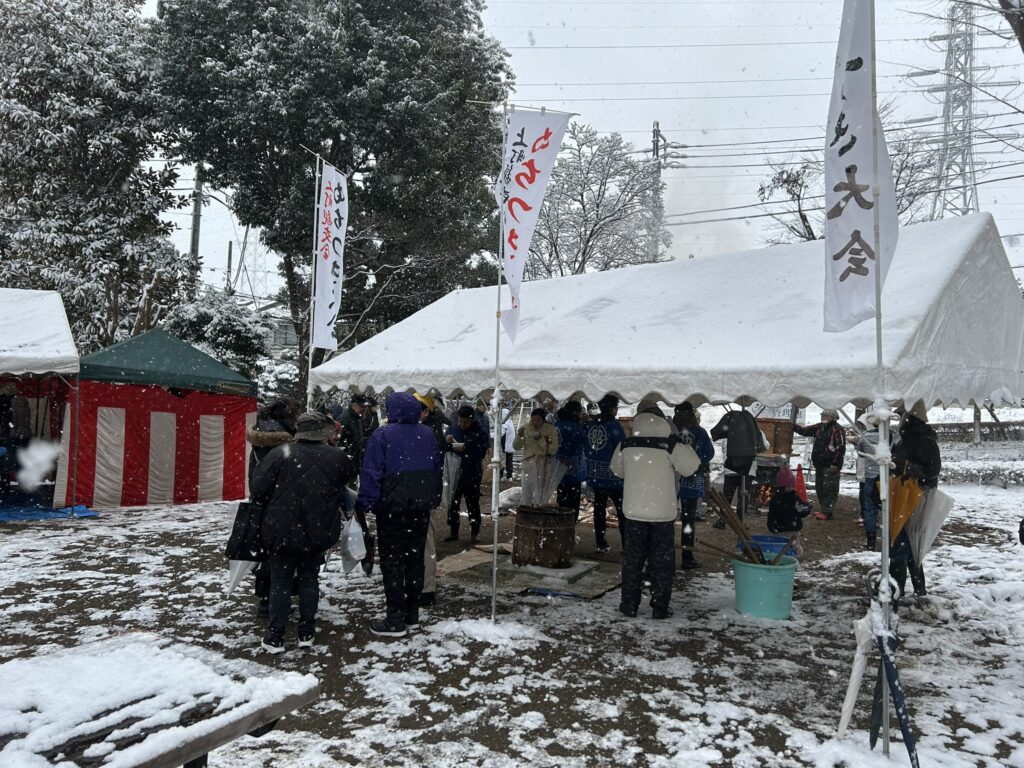 降雪中のため、餅つきはテントの下で行いました。